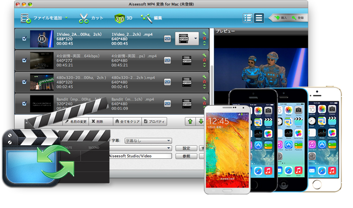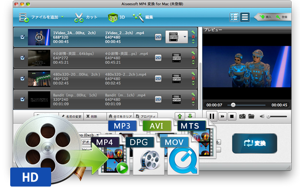 - MMPEG、VOB、MXF、WTV、DAT、MP4、M4V、MTS、M2TS、TS、RM、RMVB、WMV、ASF、MKV、AVI、3GP、3G2、FLV、SWF、MPV、MOD、TODなどあらゆる動画形式をMP4ビデオに変換できる