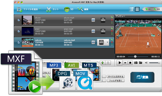 - Macで、MXF動画をMP4、MOV、AVI、WMV、3GPなどの形式に変換できる